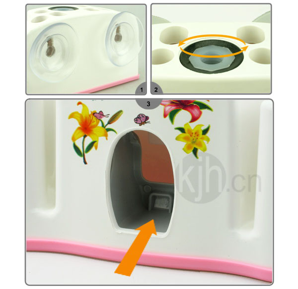 - 1.產(chǎn)品背部附強力吸盤,可固定在玻璃或光滑表面,更省空間。