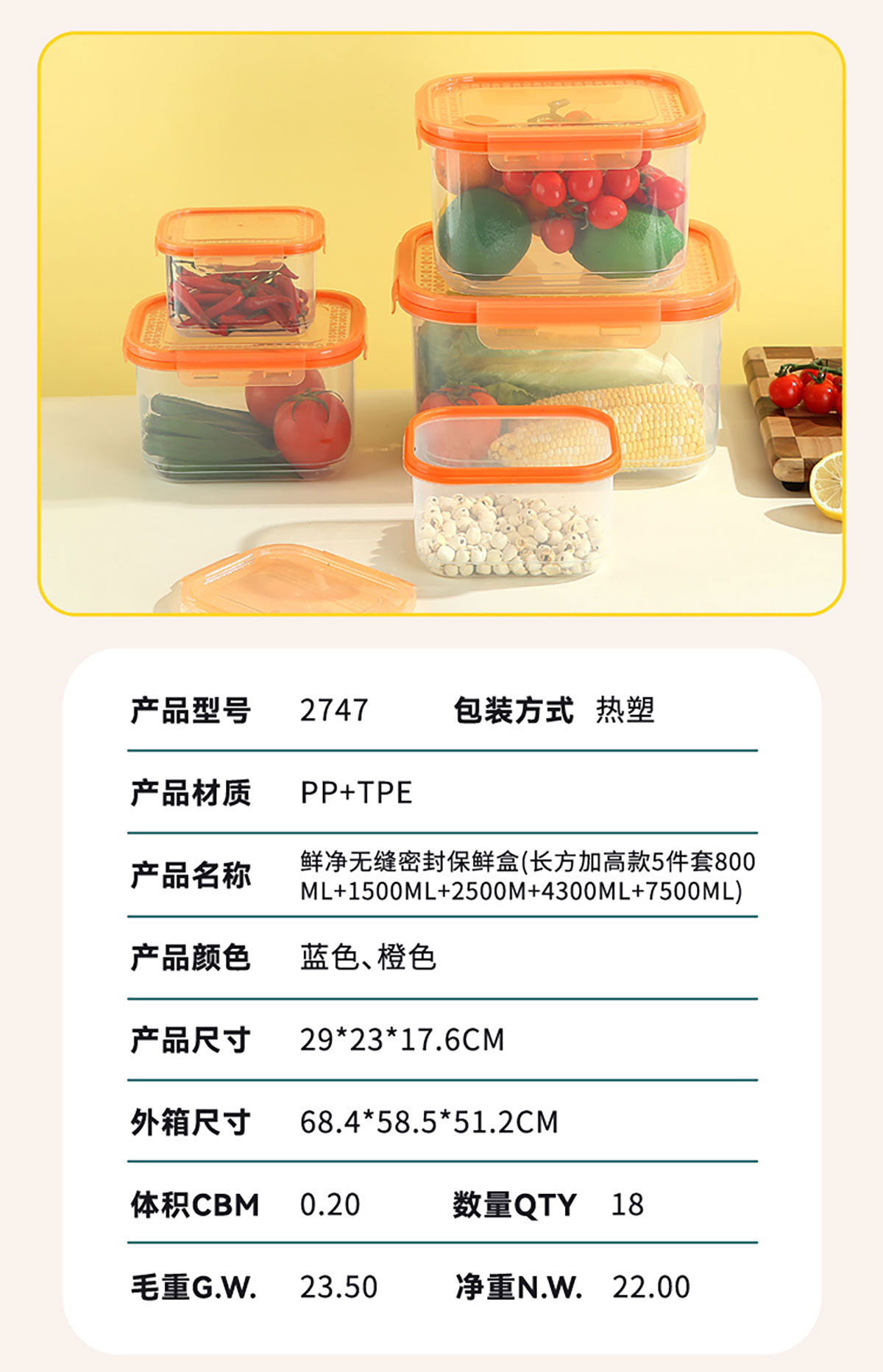AQX-2747:290*230*176mm/長方加高款5件套800ml+1500ml+2500ml+4300ml+7500ml
