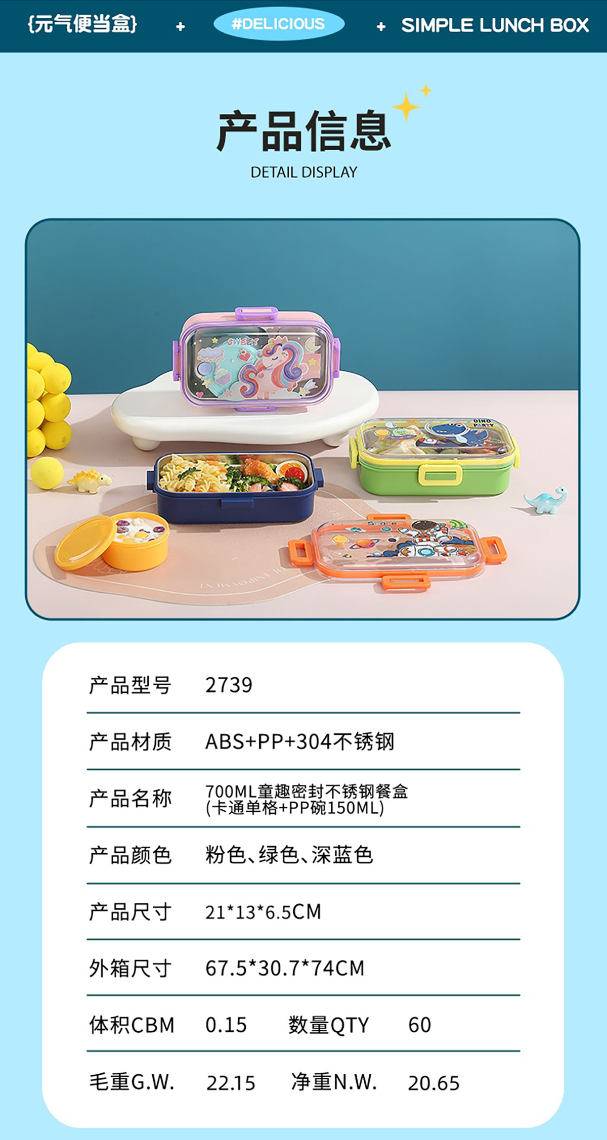 700ml童趣密封不銹鋼餐盒(單格+PP碗150ml/2格+沙拉碗80ml/2格+不銹鋼碗100ml)