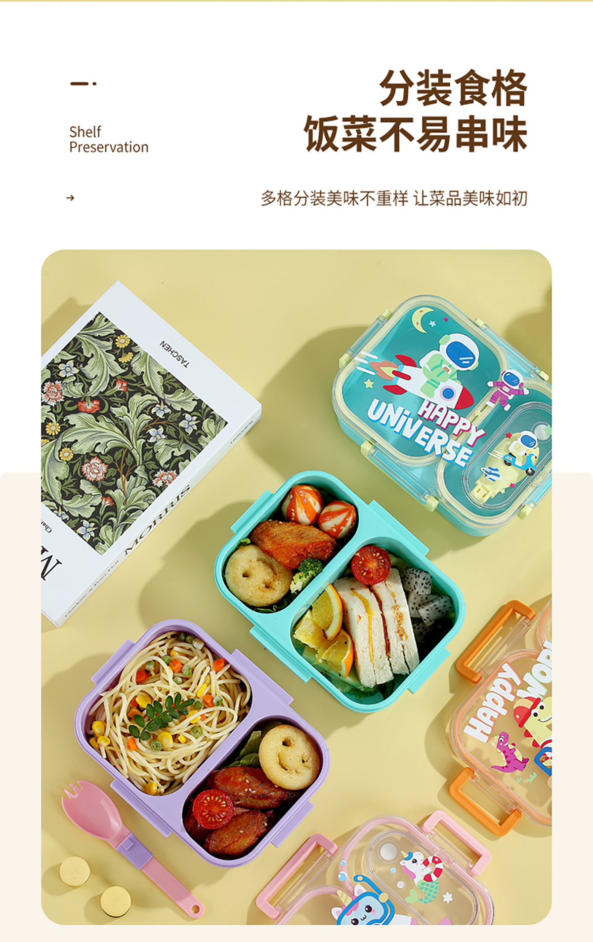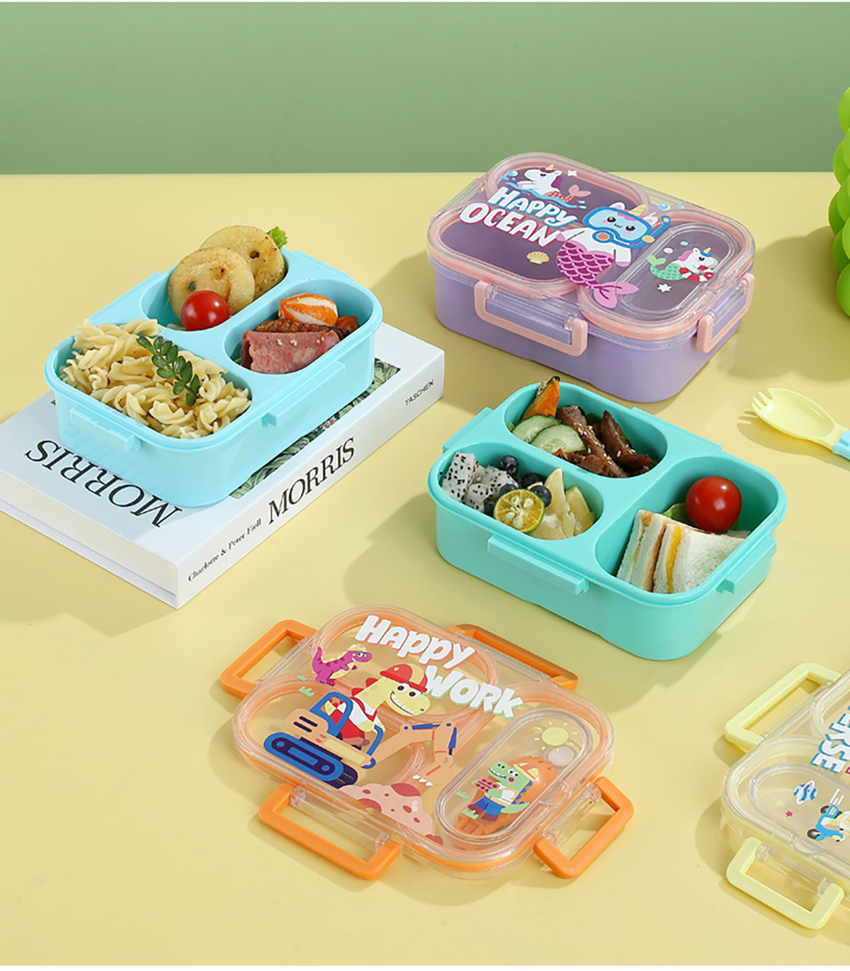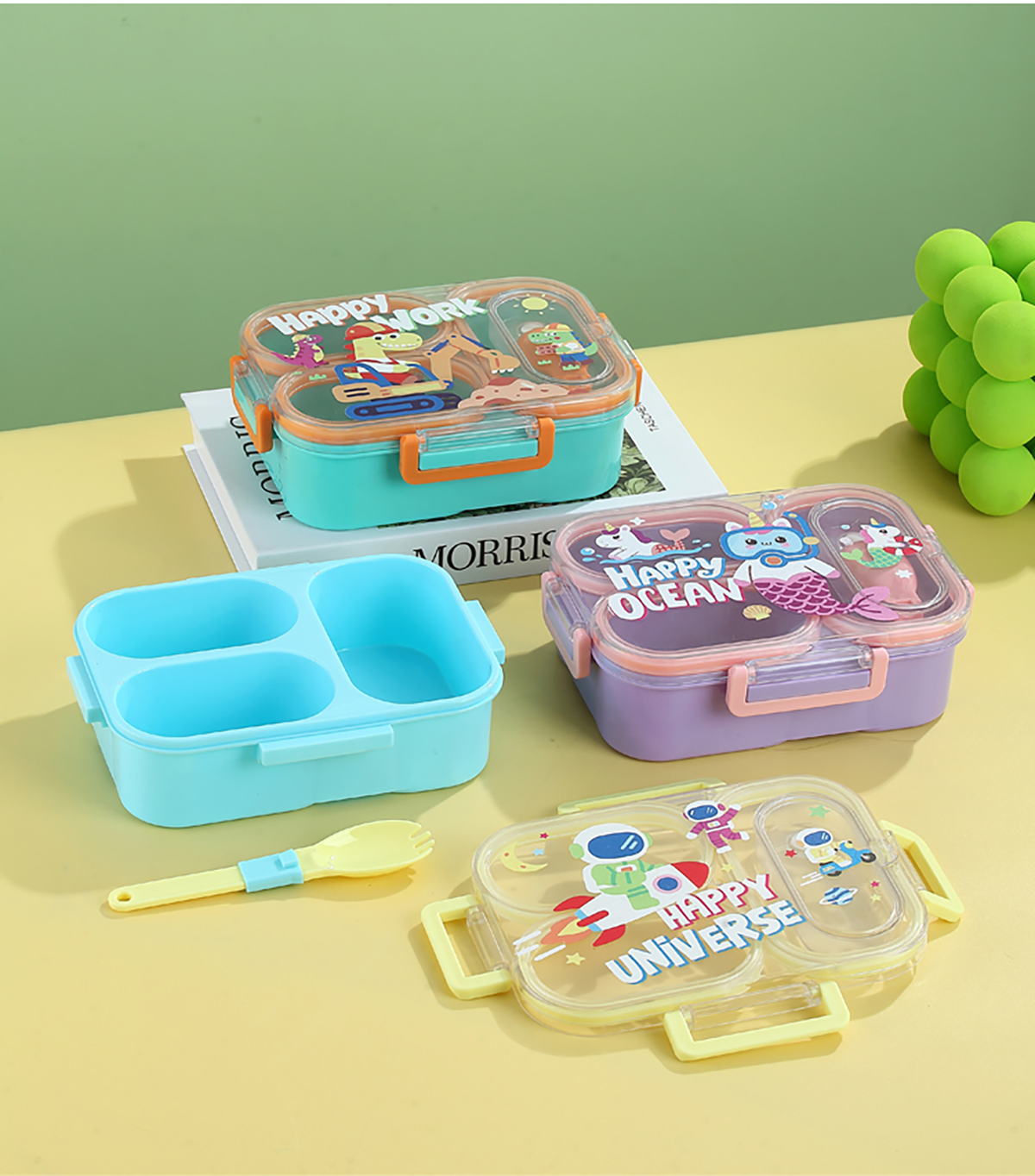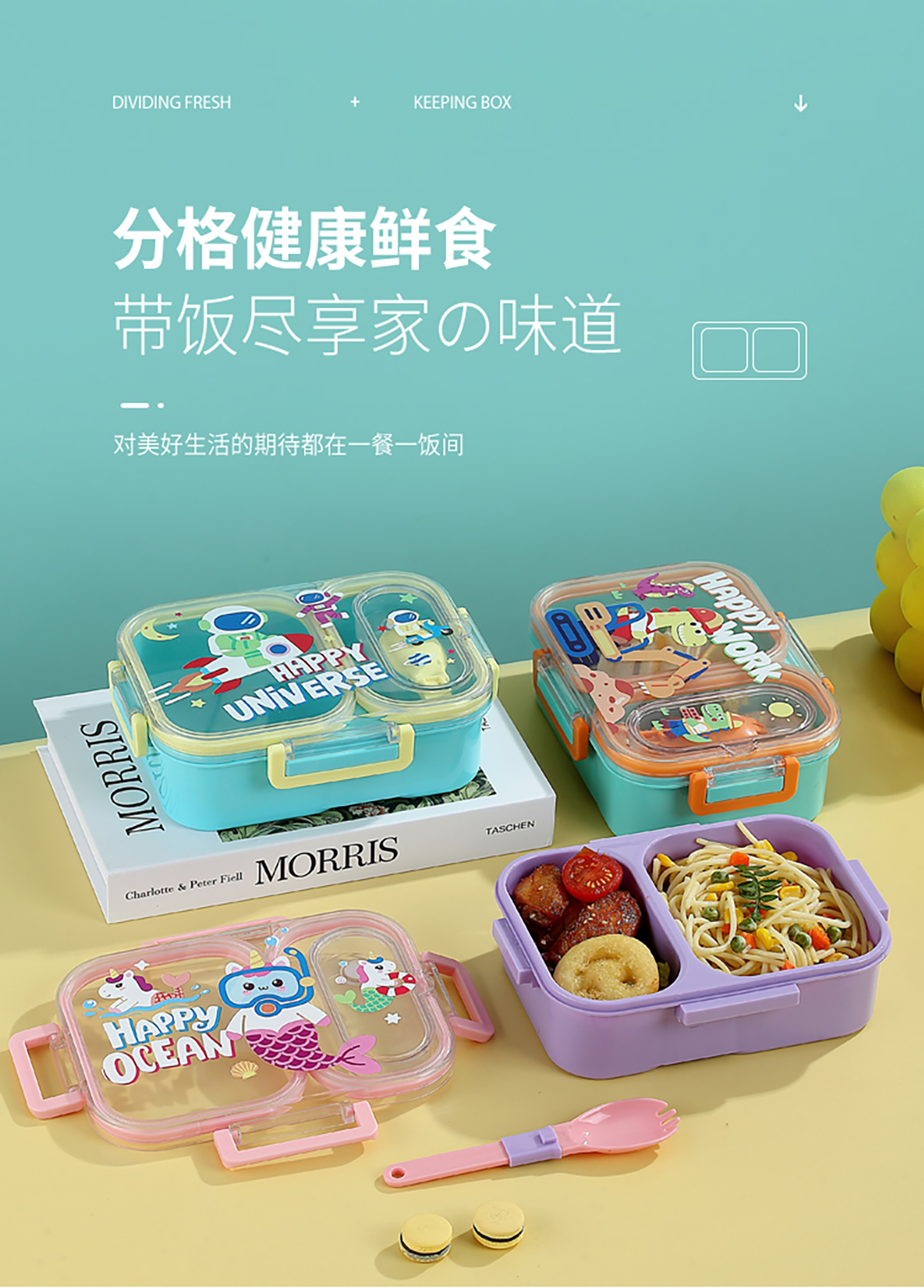 UV獨立密封卡通塑料餐盒2格900ml/3格850ml(配PP折疊湯勺)